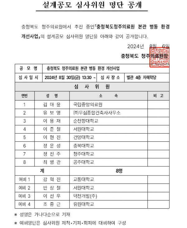 충청북도청주의료원 본관 병동 환경개선 사업 심사위원 명단 공지 페이지 정보 작성자 정우찬 작성일24-08-06 14:21 조회7,462회 댓글0건 관련링크 이전글 다음글 목록 본문 충청북도청주의료원 본관 병동 환경개선 사업 심사위원 명단을 위와 같이 공지합니다. 이전글 다음글 목록