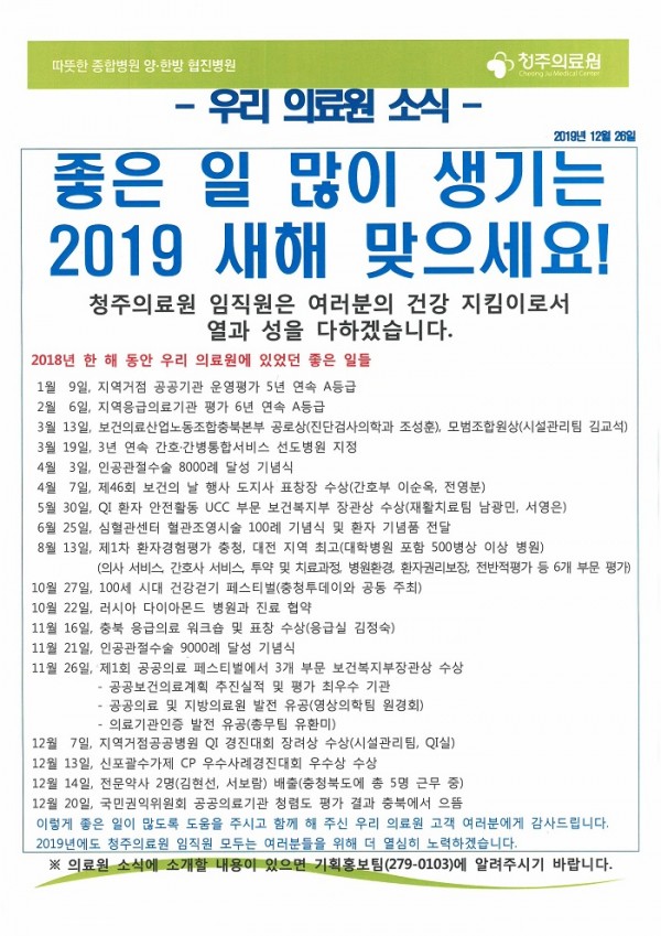 좋은 일 많이 생기는 2019 새해 맞으세요! 페이지 정보 작성자 박성우 작성일18-12-26 10:16 조회10,870회 댓글0건 관련링크 이전글 다음글 목록 본문 좋은 일 많이 생기는 2019 새해 맞으세요!청주의료원 임직원은 여러분의 건강 지킴이로서 열과 성을 다하겠습니다. 이전글 다음글 목록