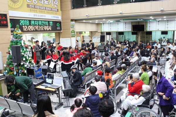 충청북도 청주의료원(원장 손병관)은 지난 20일 의료원 본관 1층 로비에서 ‘2018년 환자위안의 밤 행사’를 가졌습니다. 청주의료원 환자위안의 밤 행사는 해마다 약 300여명 이상이 참석하고 즐기는 연말 행사로, 내원하는 고객에게 깊은 감사의 뜻을 전하고 장기간의 입원생활로 지쳐있는 환우 및 보호자에게 활력의 시간을 선사하는 시간으로 자리매김 하고 있습니다.