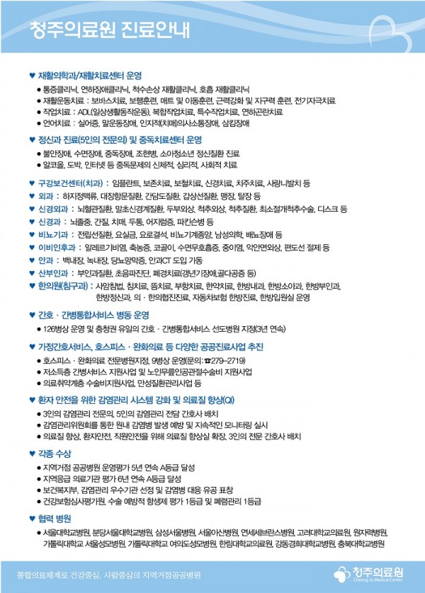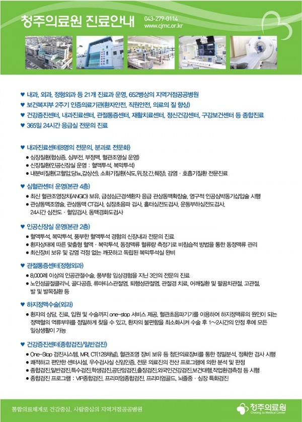 청주의료원 진료 안내문(전단) 페이지 정보 작성자 박성우 작성일18-05-25 10:55 조회10,169회 댓글0건 관련링크 이전글 다음글 목록 본문 청주의료원 진료 안내문을 첨부합니다. 이전글 다음글 목록