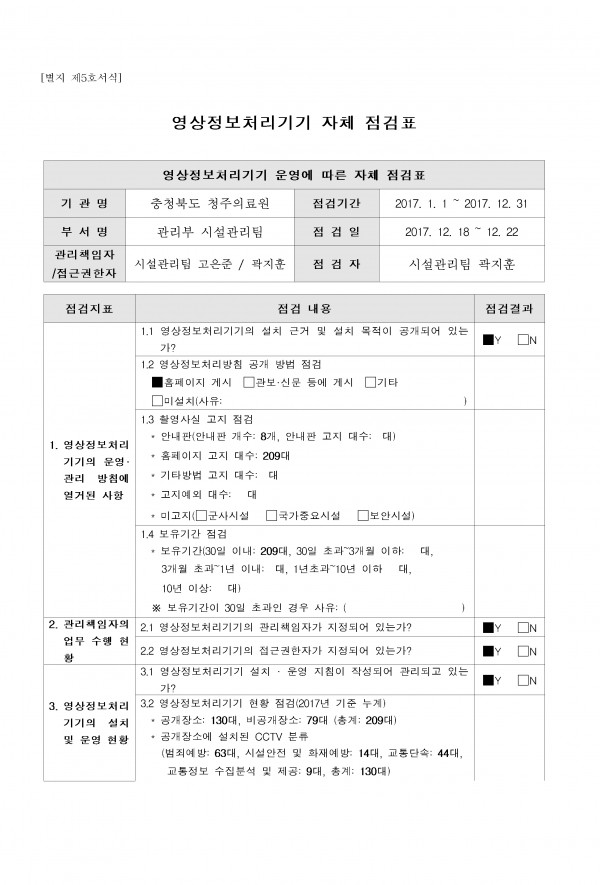 충청북도 청주의료원은 개인영상정보처리기기 설치 운영 지침에 의거한 자체점검을 실시하고 점검 결과를 첨부와 같이 공지합니다.