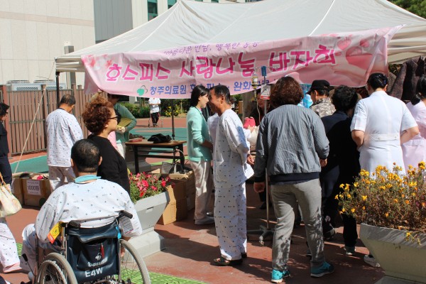 청주의료원은 23일(월) 오전 10시부터 의료원 본관 1층 로비 및 쉼터에서 '호스피스·완화의료 사랑나눔 바자회'를 개최했다. 이번 행사는 내원고객 및 지역주민에게 호스피스·완화의료에 대한 관심을 고취시키고 바자회를 통해 말기암 환자 및 가족의 경제적 지원을 위한 기금을 마련하고자 진행됐다.